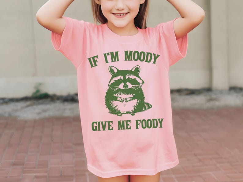 Bring a smile to everyone's face with our "If I'm Moody Give Me Foody" Toddler Tee! This whimsical and funny youth top is perfect for preschoolers, kindergarteners, and elementary-age kids who like to express their playful attitude. Featuring a cute raccoon graphic and a hilarious quote, this unisex shirt adds a dash of humor to any outfit.