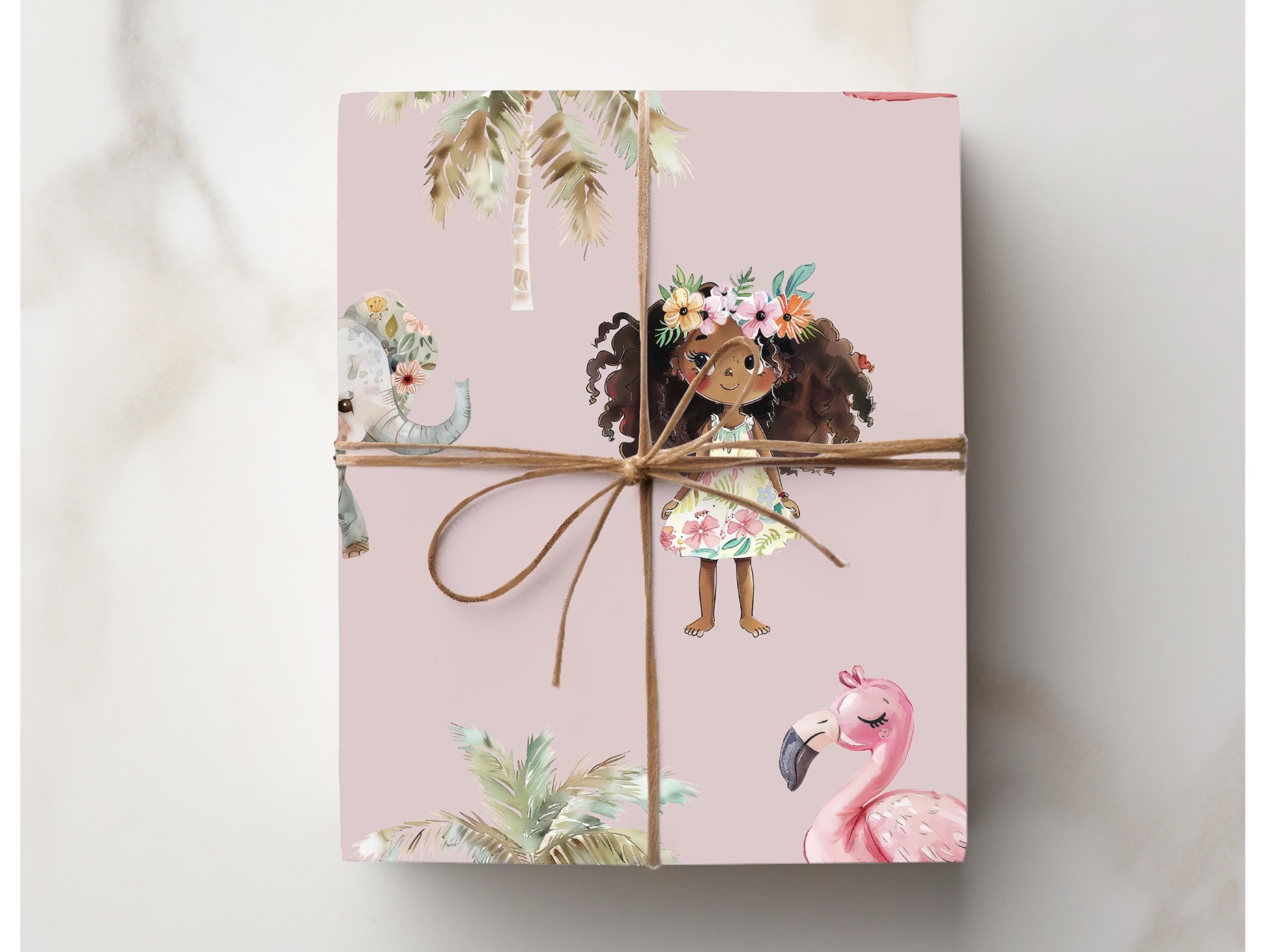Jungle Theme Birthday Girl Gift Wrap African American Beauty Wrapping Paper Summer Celebration Paper Tropical Dusty Pink Baby Shower