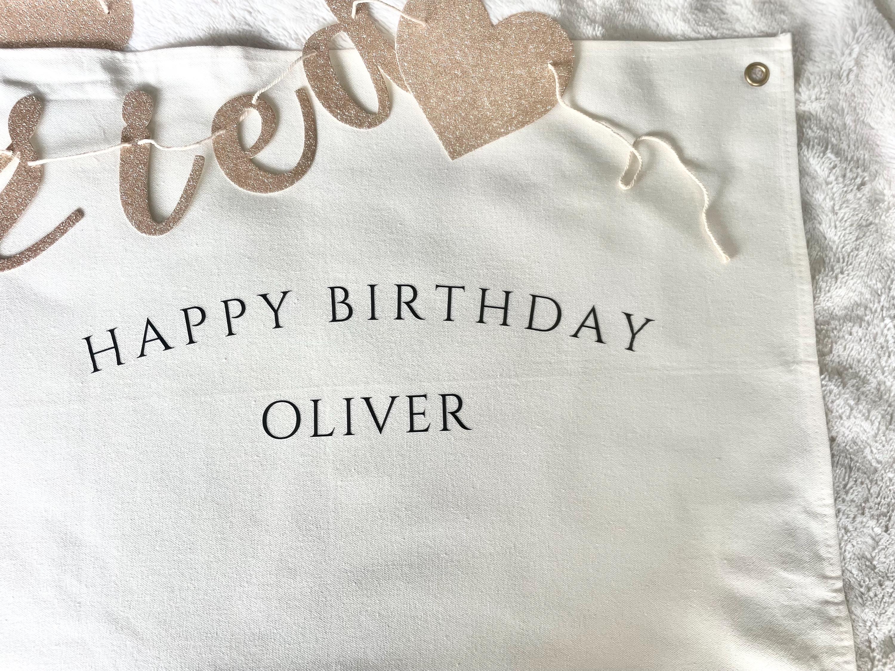 Personalized Happy Birthday Name Girl Fabric Canvas Wall Hanging Sign Eco Friendly Banner Boho Decor Nursery Flag Heirloom Children 17x25"