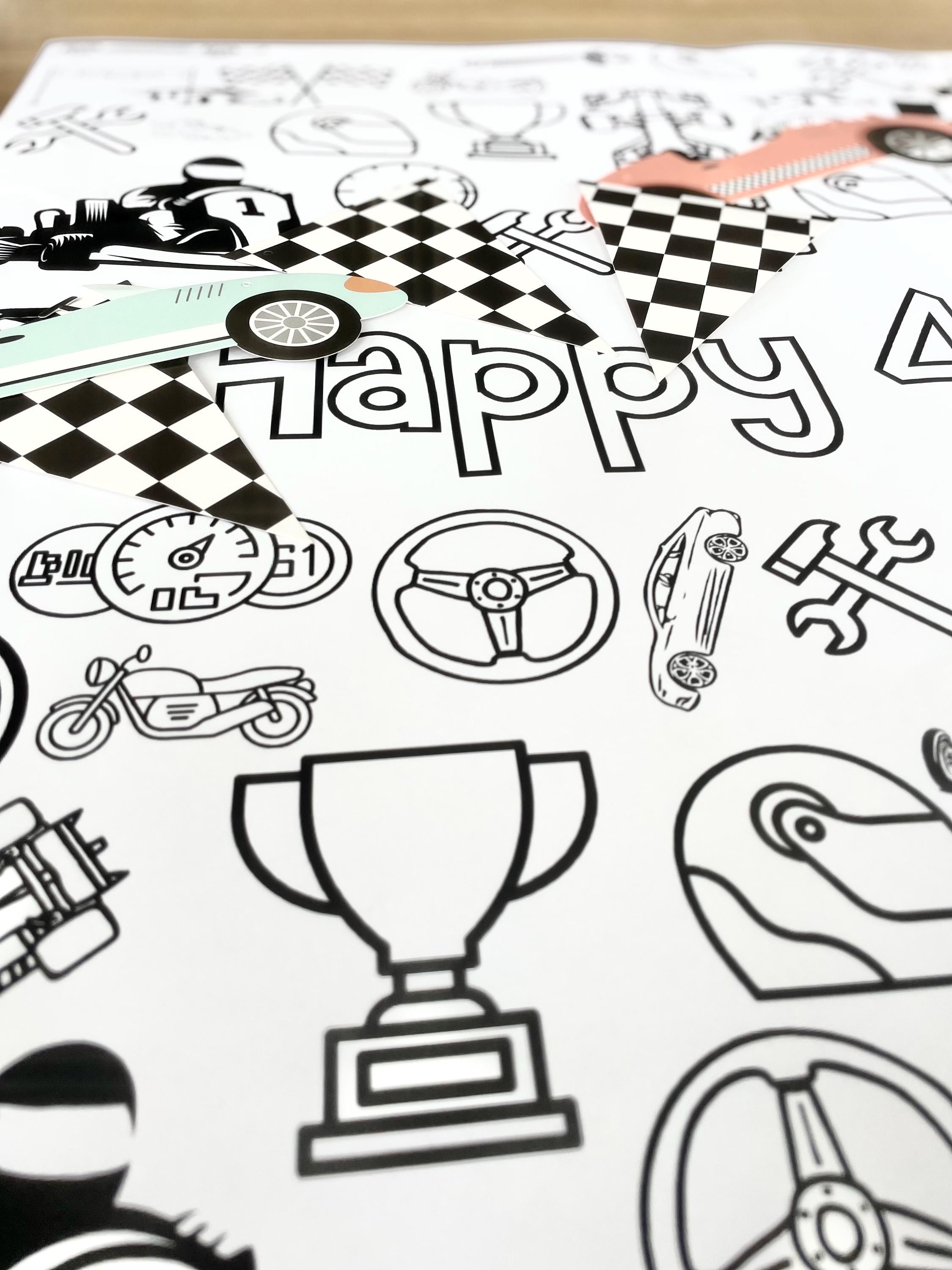 LARGE 6-foot Race Car Theme Coloring Banner Personalized Birthday Poster Table Custom Roadster Checkered Birthday Tablecloth Party ideas 72"