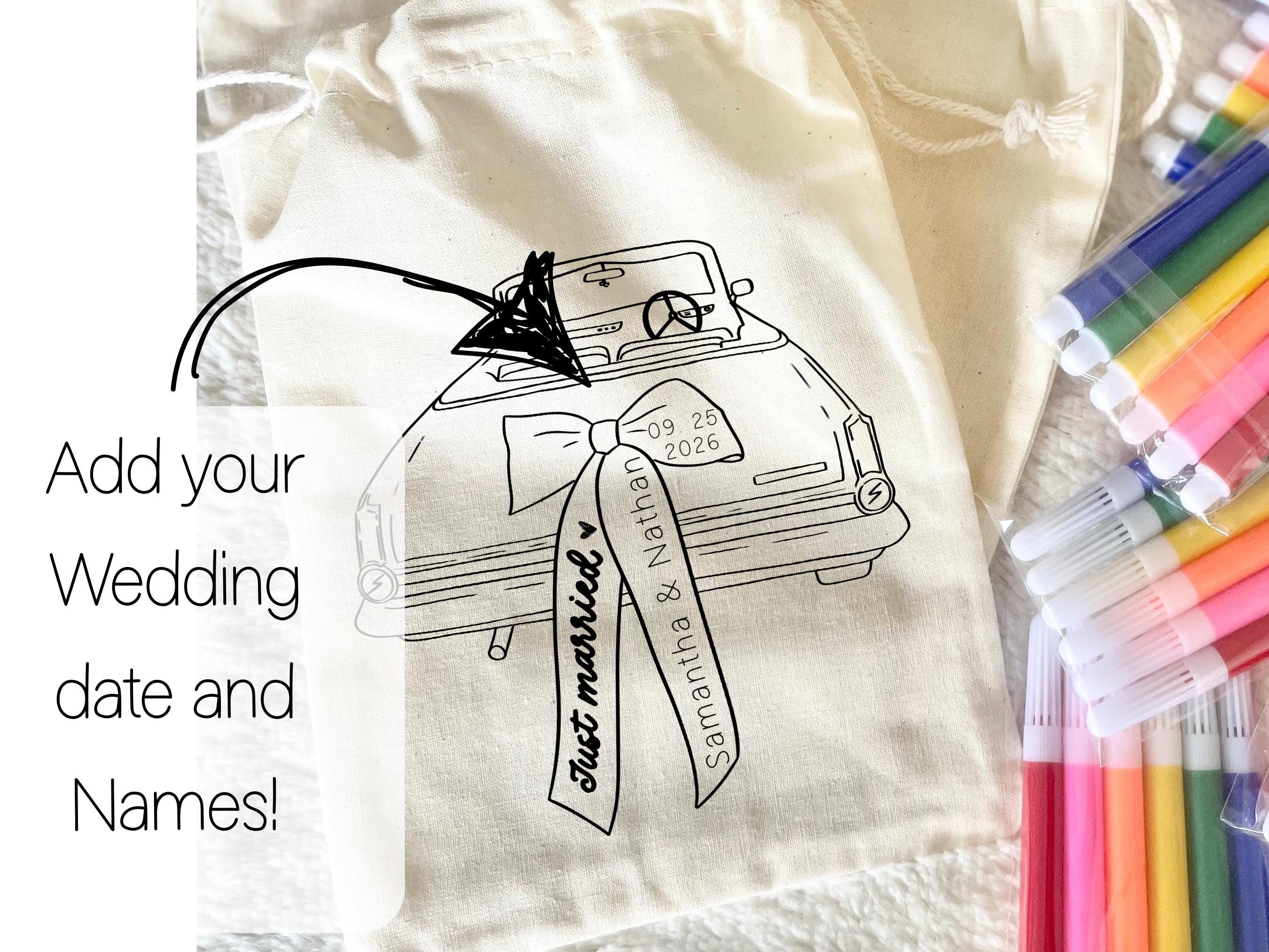 ✨ 1 custom cotton drawstring bag with “Just Married” car design