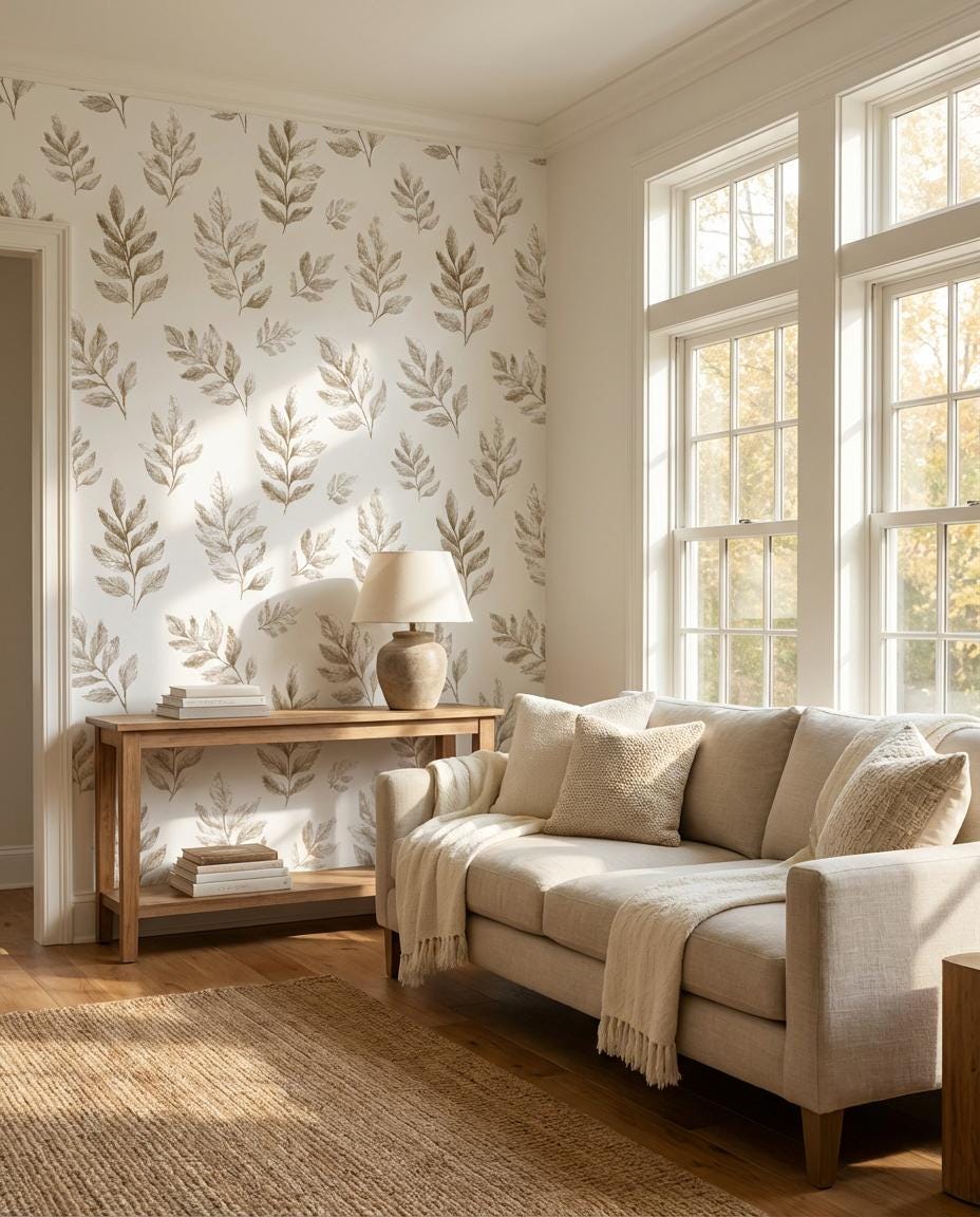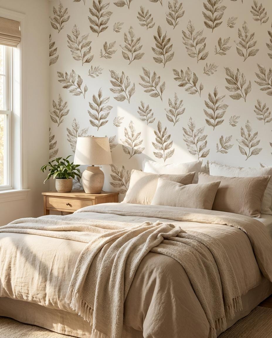 Two Tone Pressed Leaf Botanical Wallpaper Seamless Pattern Bedroom Neutral Design Nature Beige Soft Tone Leaves Cream Hallway Mural Renter Friendly